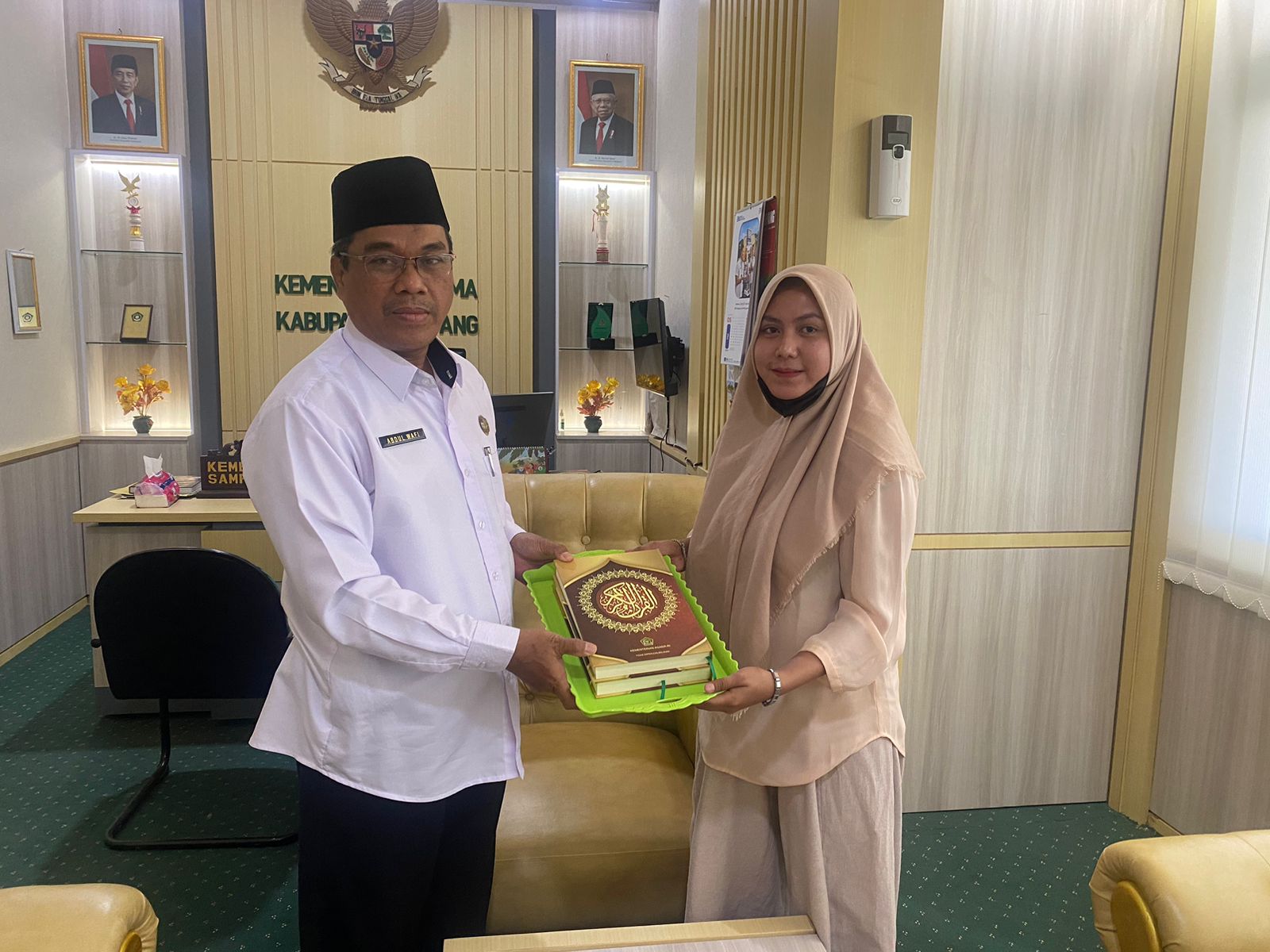 Monika Wara Santi mengucapkan dua kalimat syahadat di Ruang Kerja Kepala Kemenag Sampang. Ia dibimbing langsung oleh oleh Kepala Kantor Kementerian Agama (Kemenag) Kabupaten Sampang, Abdul Wafi .