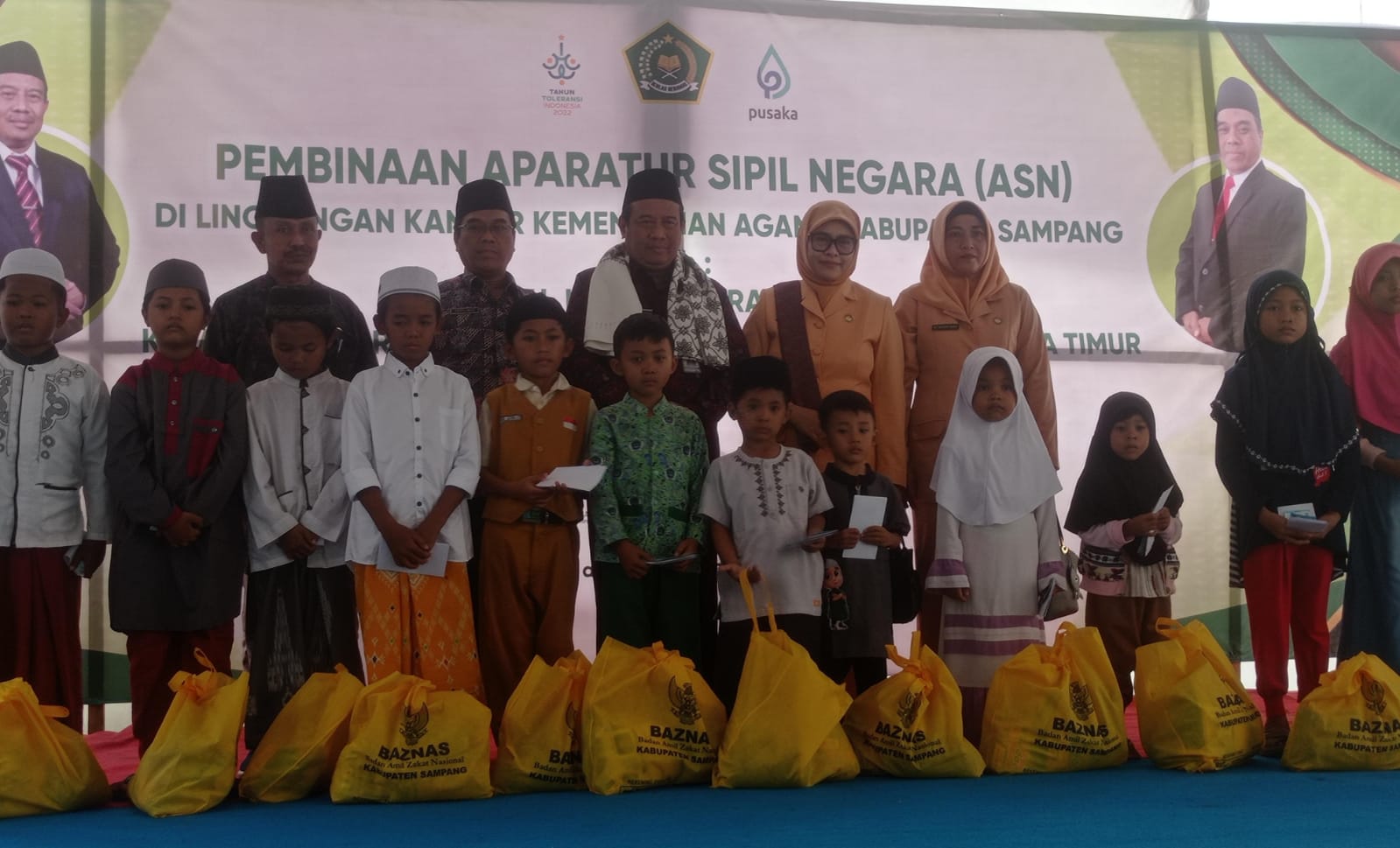 Selajutnya, Kakanwil beserta istri didampingi KaKan Kemenag Sampang beserta istri ,menyerahkan santunan dan bantuan sembako kepada puluhan anak yatim piatu.